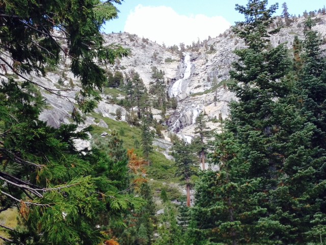We could always visually see the waterfall in front of us, and even if for a moment the waterfall was obscured by a big evergreen tree it was only momentarily covered. As we hiked, it was our visual reminder of where we were heading. Never loosing sight of the waterfall ahead of us, that was what kept us on track. After what seemed forever on the trail, we came to a place where we were hiking over massive granite boulders, the heat from the sun was pressing down on us from above and the heat from the rocks coming up were colliding on our bodies, and we were all exhausted. Remember we don’t hike, so apparently you should bring plenty of water while hiking…. One of our children drank his entire bottle of water within the first 20 minutes of the hike and was now begging for someone else’s water. One of our other children in desperation asked if we could just turn around and go back.